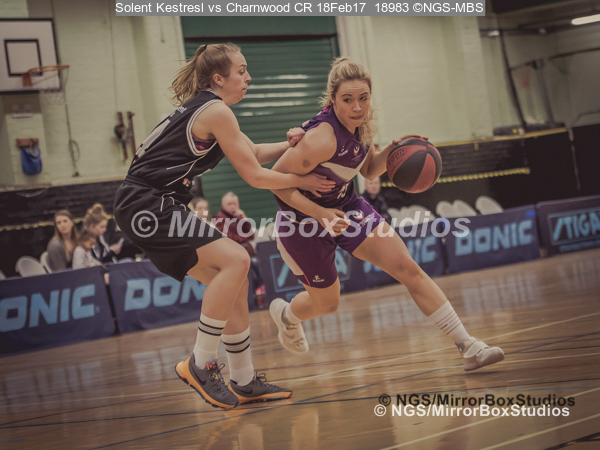 WNBL Division 1 – 18 February, 2017 – St Marys Leisure Cent. : Mel Curson (14) 1 on 1 with K McDavid (15) during match between Solent Kestrels Women and Charnwood CR (Photo by NGS/MirrorBoxStudios)