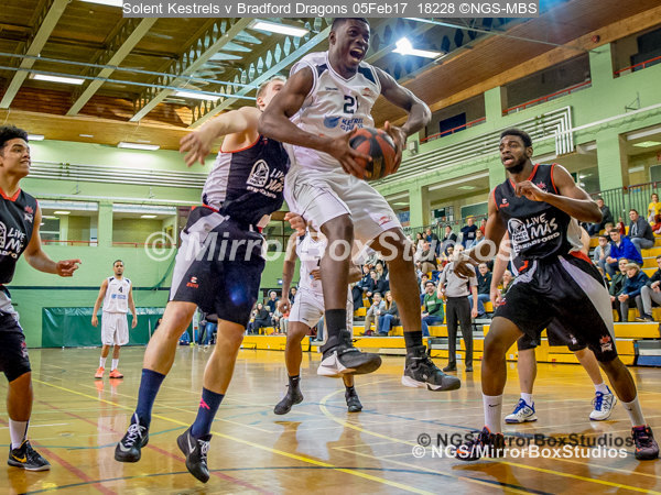 Solent Kestrels NBL Division 1 – 5 February, 2017 – Fleming Park Leisure Cent. : Jaylen Watson (21) collects the rebound during match against Bradford Dragons (Photo by NGS/MirrorBoxStudios)