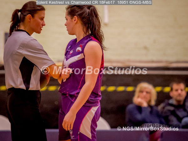 WNBL Division 1 – 18 February, 2017 – St Marys Leisure Cent. : Just checking a contact call with the Ref during match between Solent Kestrels Women and Charnwood CR (Photo by NGS/MirrorBoxStudios)