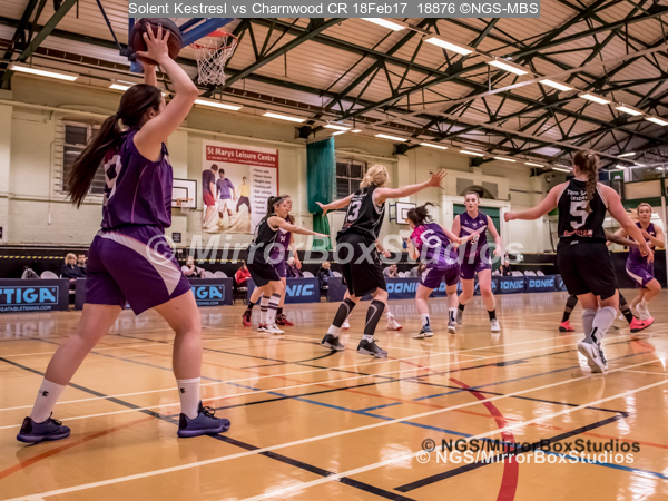 WNBL Division 1 – 18 February, 2017 – St Marys Leisure Cent. : Chloe Compton (9) maybe had on foot on the line, during match between Solent Kestrels Women and Charnwood CR (Photo by NGS/MirrorBoxStudios)