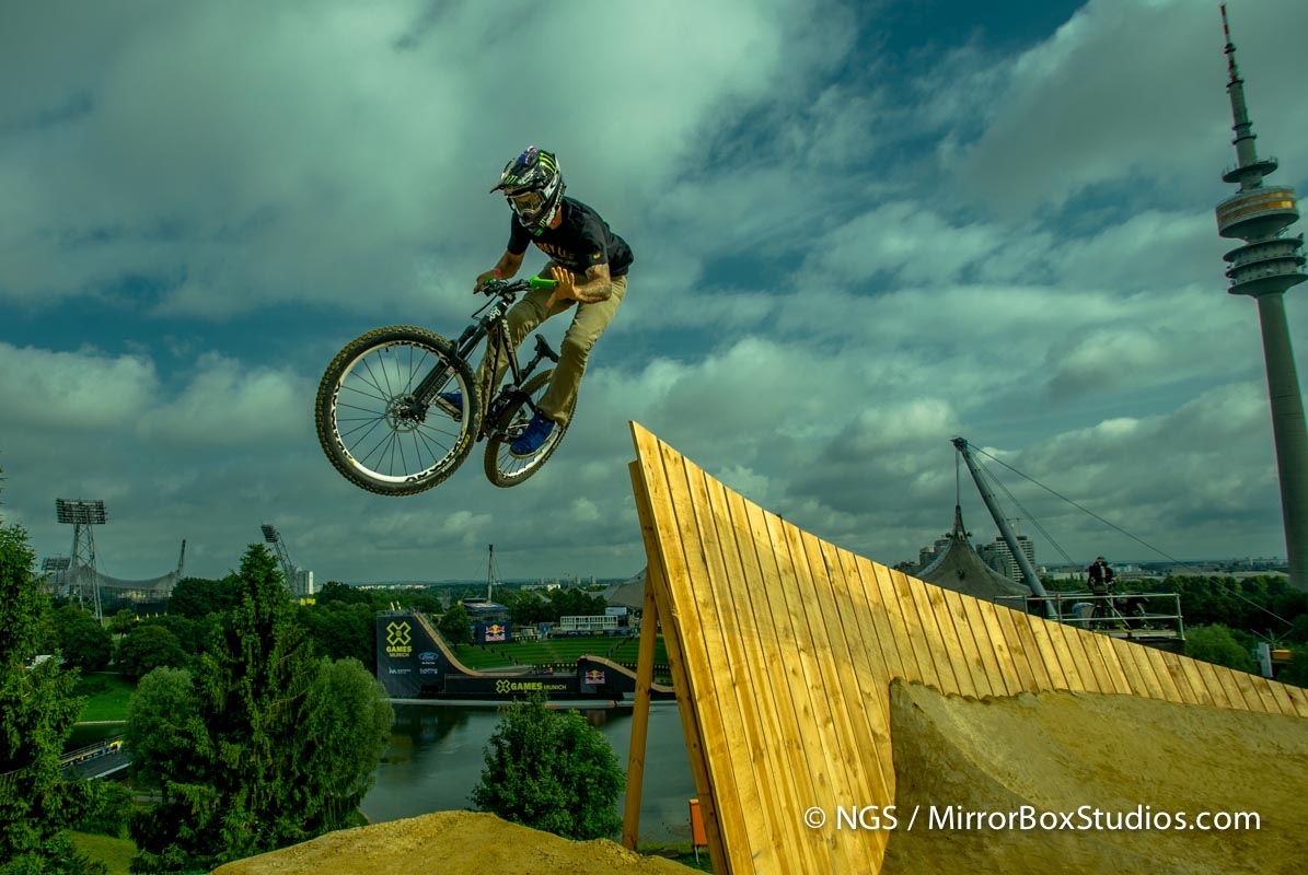 Munich, Germany – June 30, 2013 – Olympic Hill: Mountain Bike Slopestyle Practice at X Games Munich 2013.